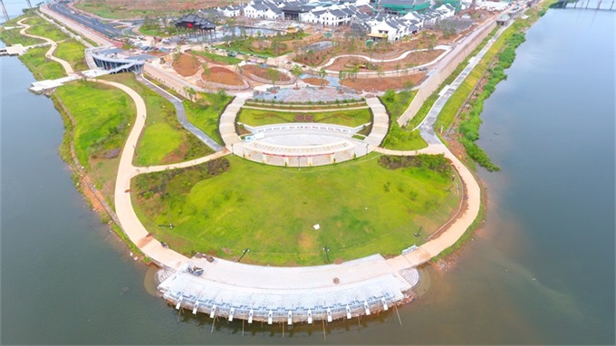 長(zhǎng)沙圩鎮(zhèn)碧道鋪設(shè)了瀝青并劃分跑道和自行車(chē)道,“顏值”再獲提升。(林翔?攝)位于梅江河圩鎮(zhèn)段碧道沿線的紅色休閑廣場(chǎng)效果....